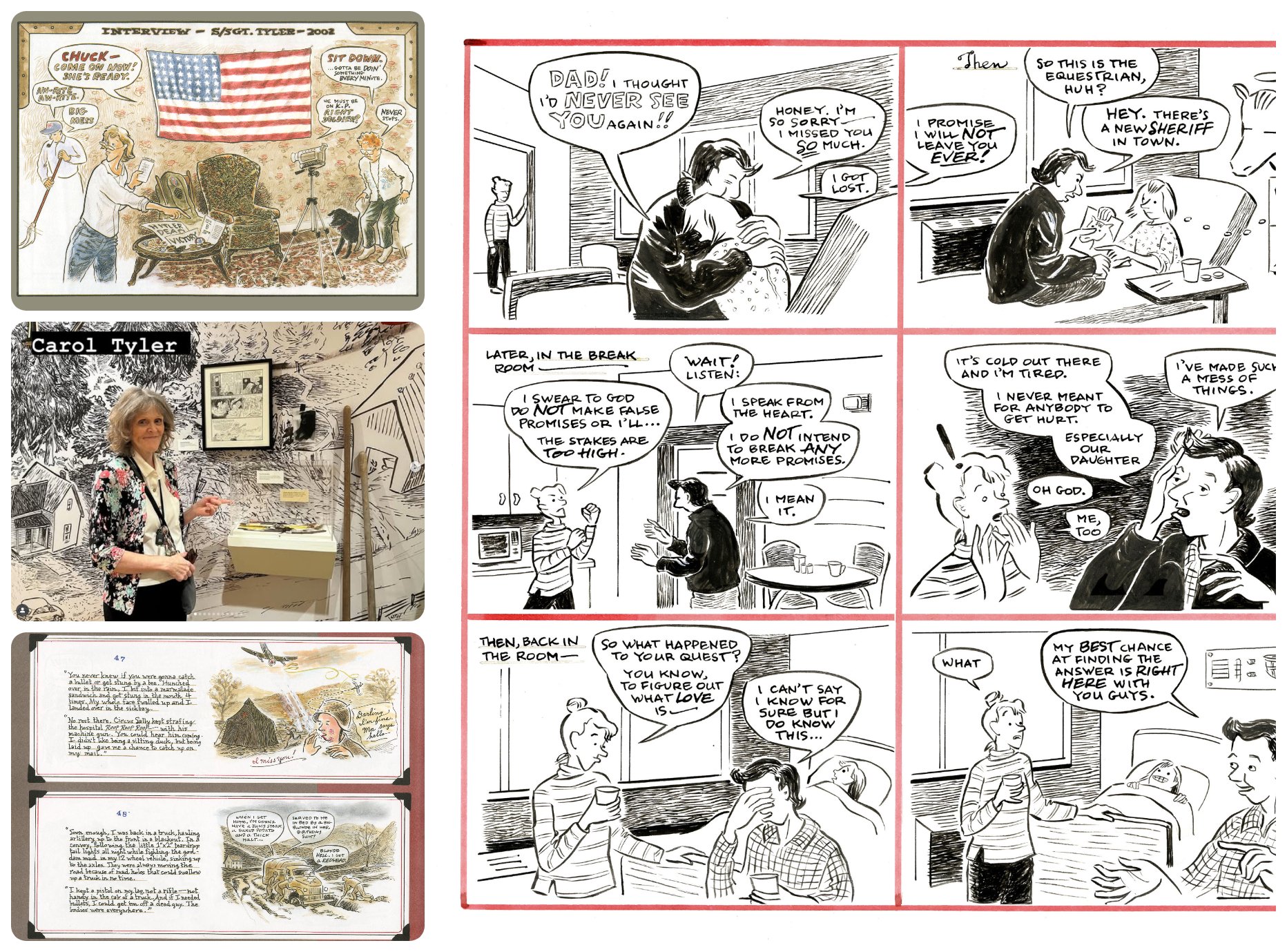 In this conversation, Carol Tyler discusses her graphic memoir Soldier’s Heart, a deeply personal work that blends visual storytelling with narrative to explore her father’s World War II experiences and their lasting impact on her family. She explains that graphic memoir is not simply illustrated text but a deliberate interplay between words and images, where each medium carries distinct emotional and informational weight. Tyler developed a unique visual language—through color palettes, panel styles, and composition—to distinguish timelines, perspectives, and emotional states.